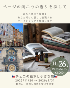 Home › 🇨🇿チェコの絵本と小さな旅🇨🇿 (1) 2025-10-27 🇨🇿チェコの絵本と小さな旅🇨🇿 (1) \ お問い合わせお待ちしております / \ メルマガでは、香りや嗅覚の話をお届けしています / 関連記事 応用講座開催レポート 「能」の香り(修学旅行編) ブランドによって印象が違う イベント企画の秘訣とサードメディスン 2回目の金沢招致 単発イベントレッスン